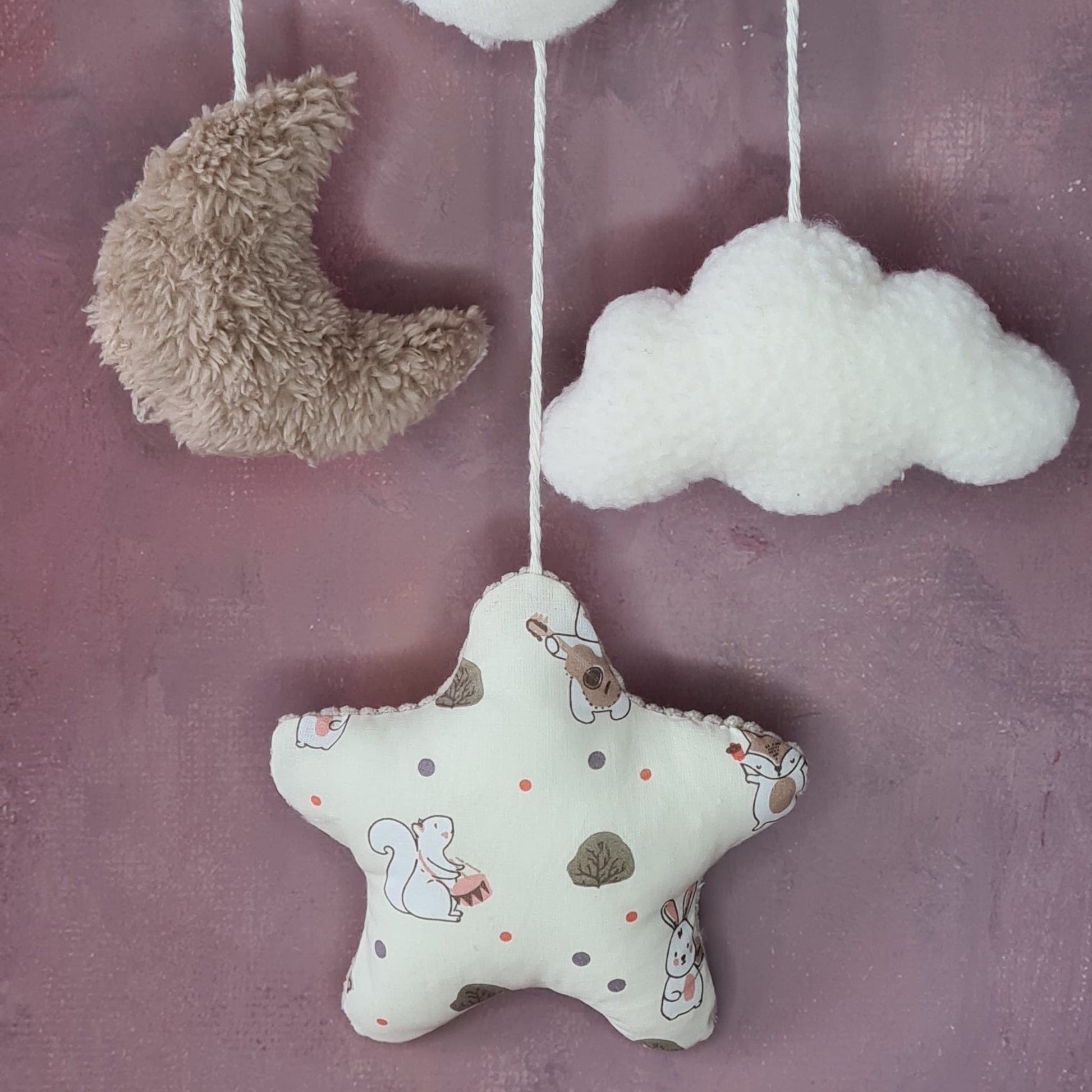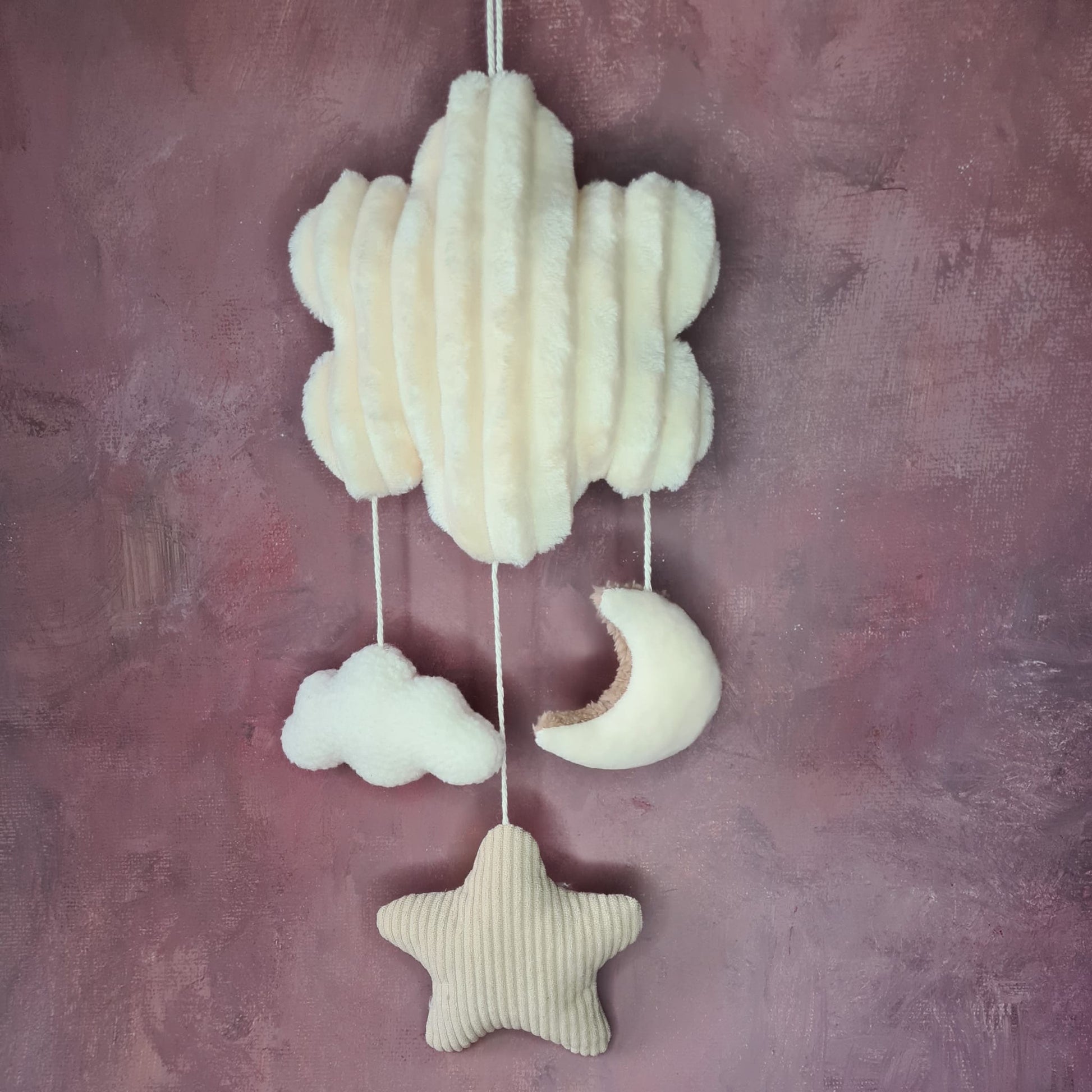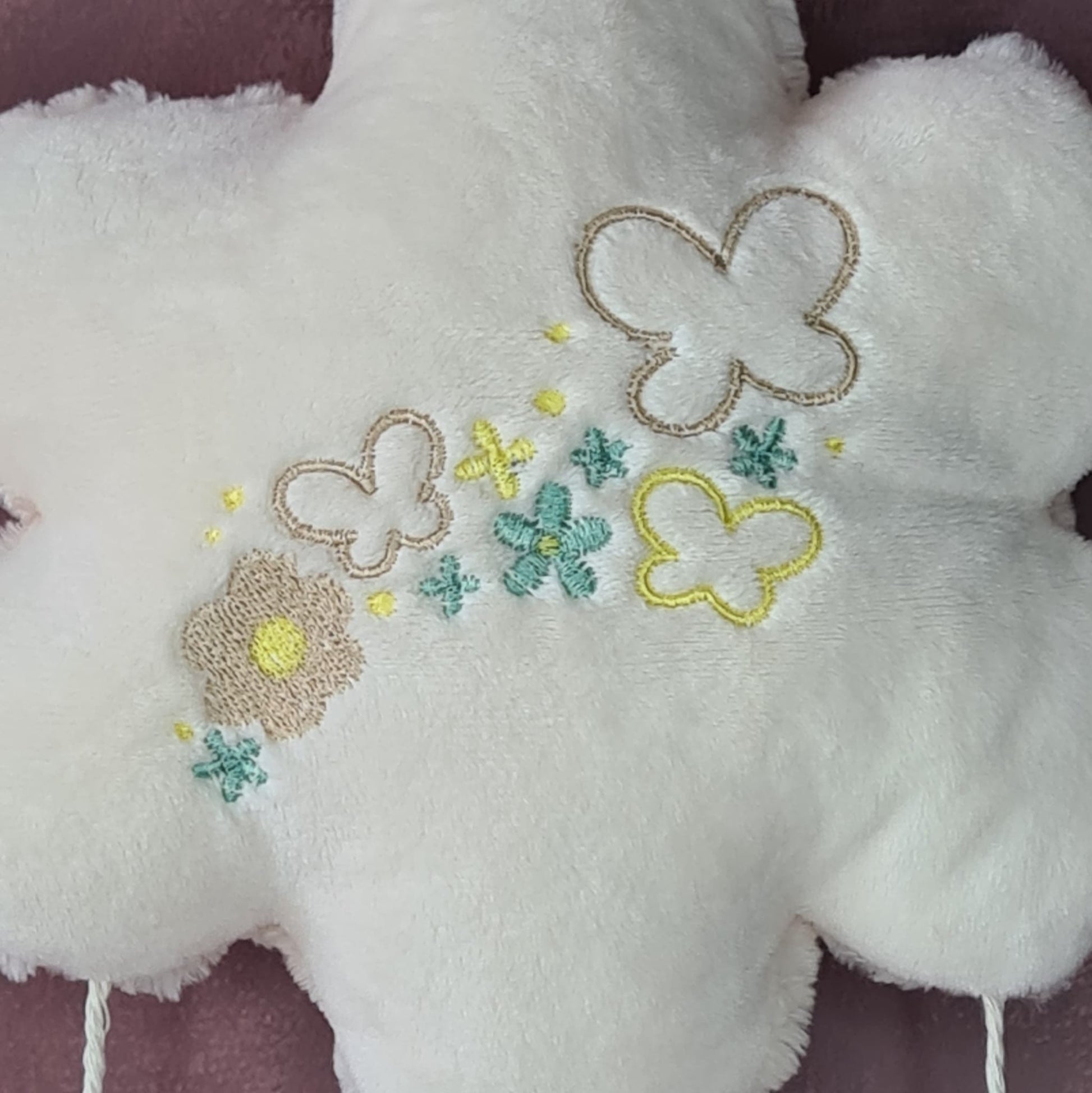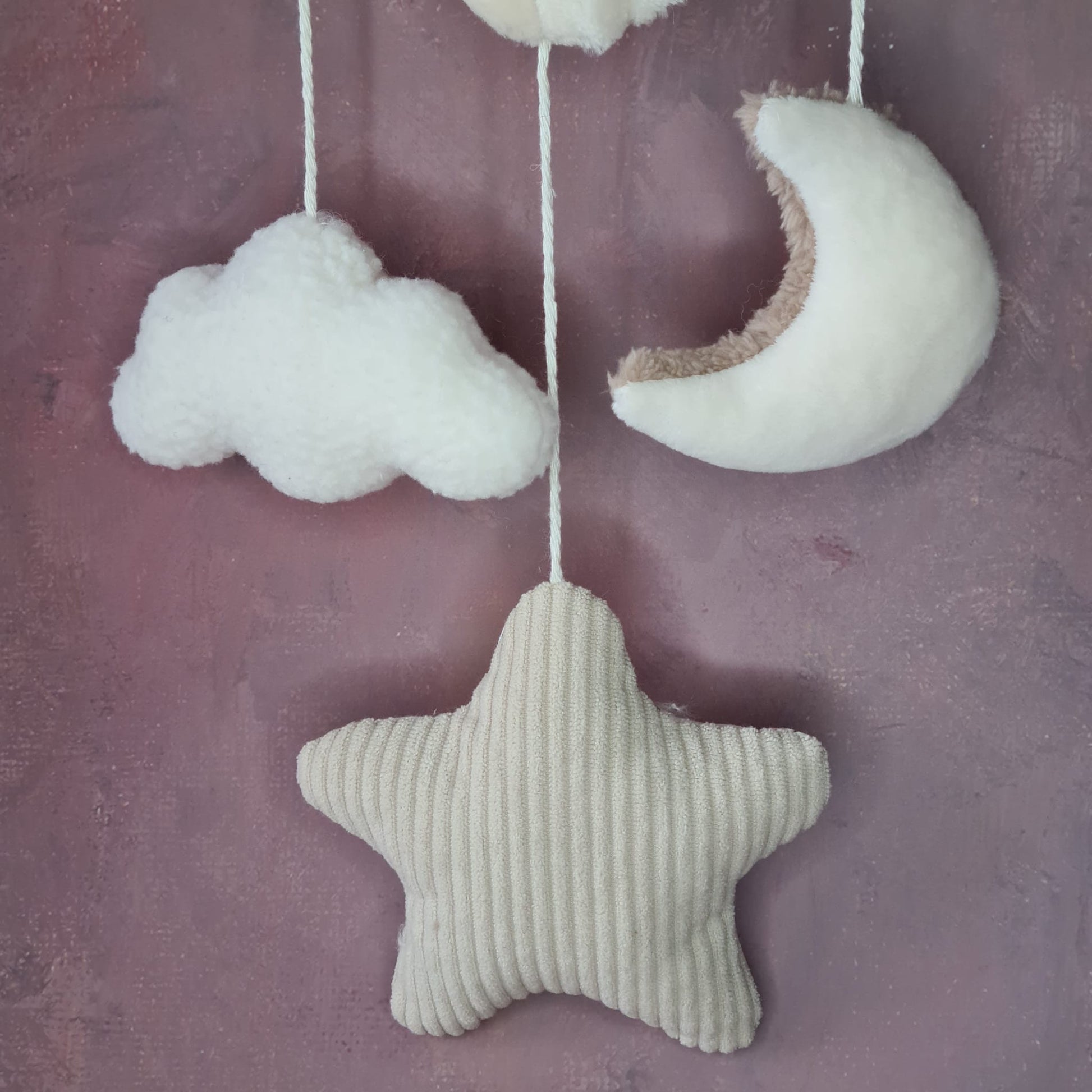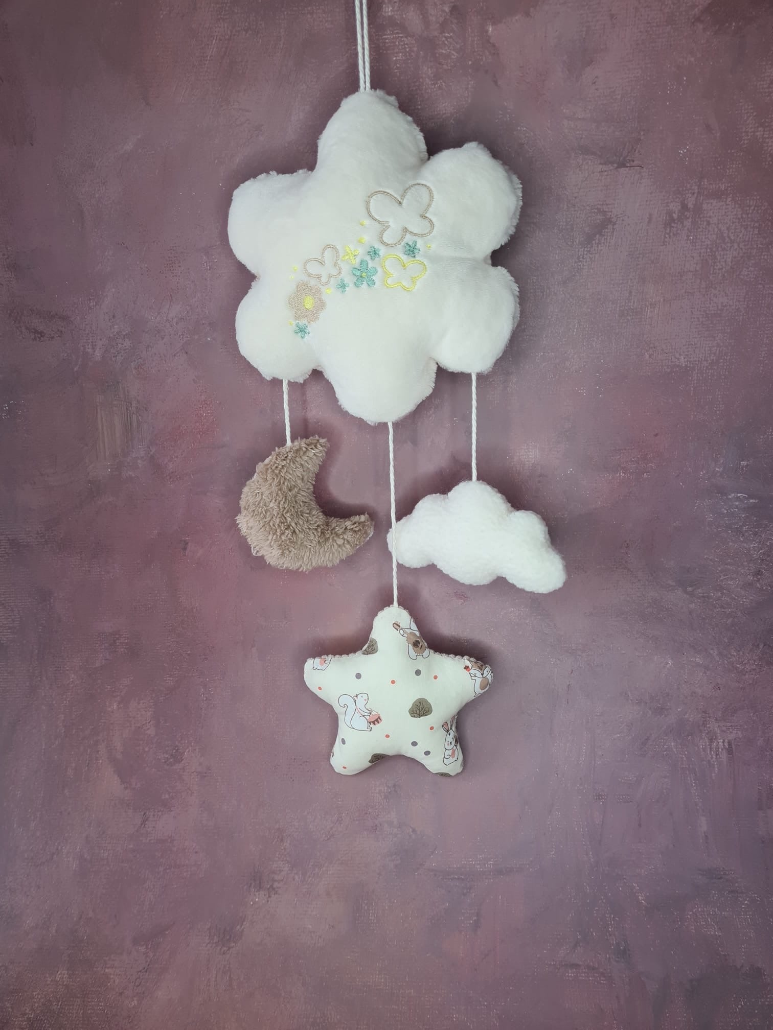 Mobile en forme de fleur, délicatement orné de broderies et accompagné de suspensions lune, étoile et nuage, pour une touche douce et poétique dans la chambre de bébé.