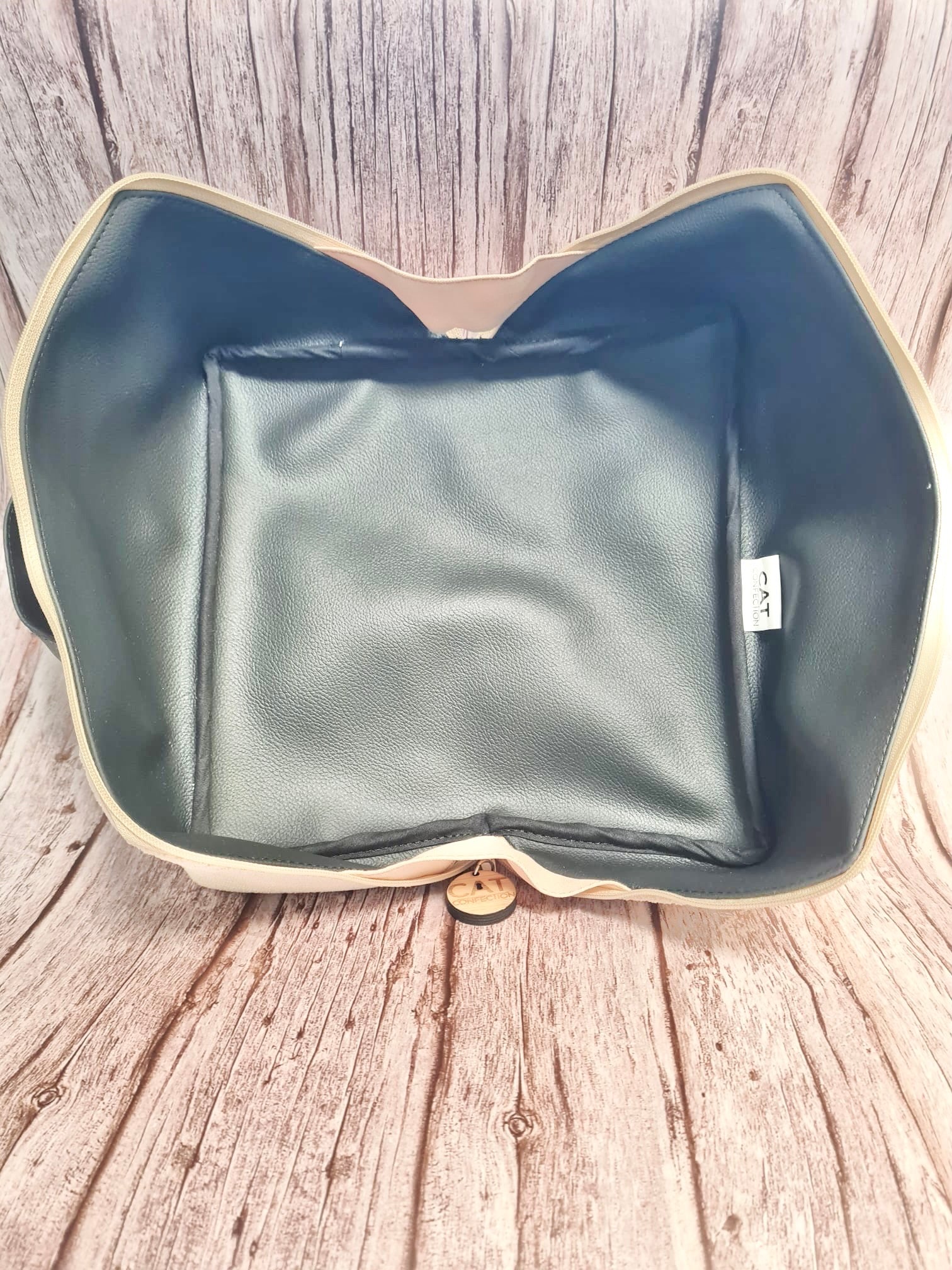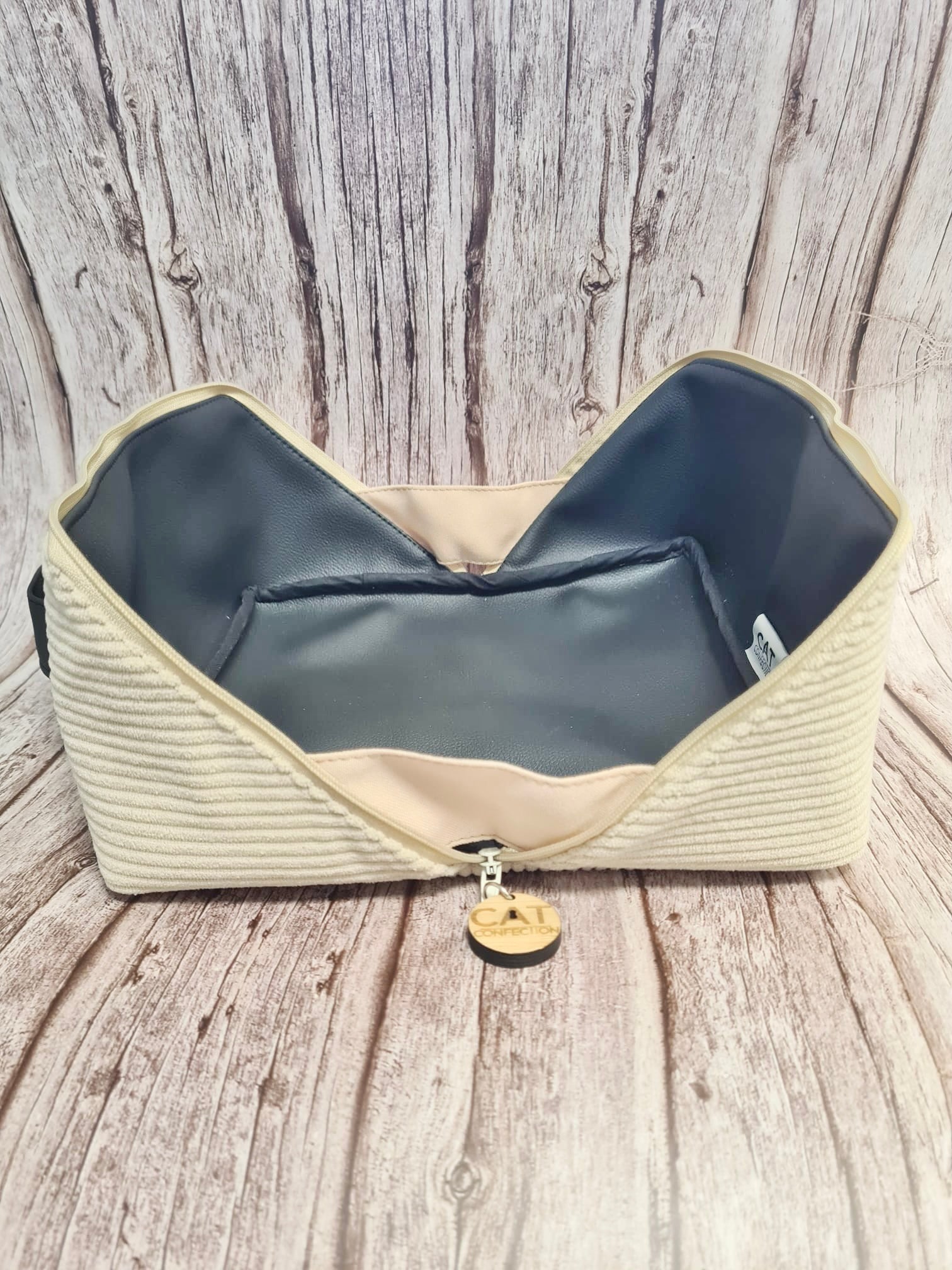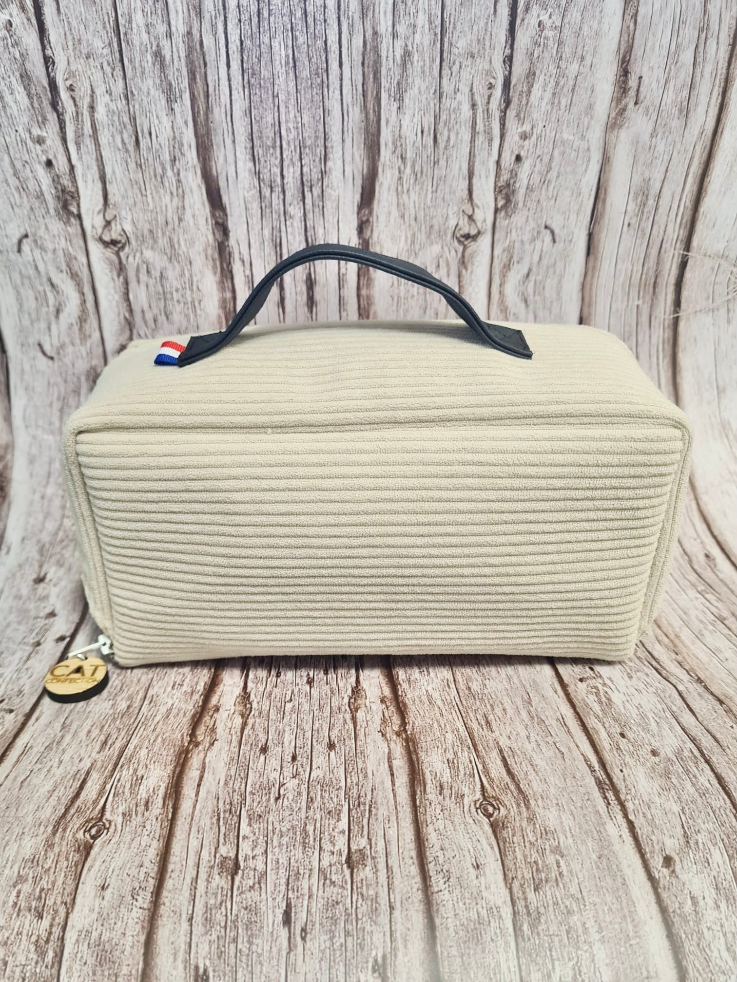 Trousse beige en velours côtelé, pratique et élégante, dotée d’un intérieur en simili cuir noir. Multi-usage, elle dispose d’une ouverture complète et d’une poignée en simili cuir, en rappel de l’intérieur, pour une prise en main facile et raffinée.