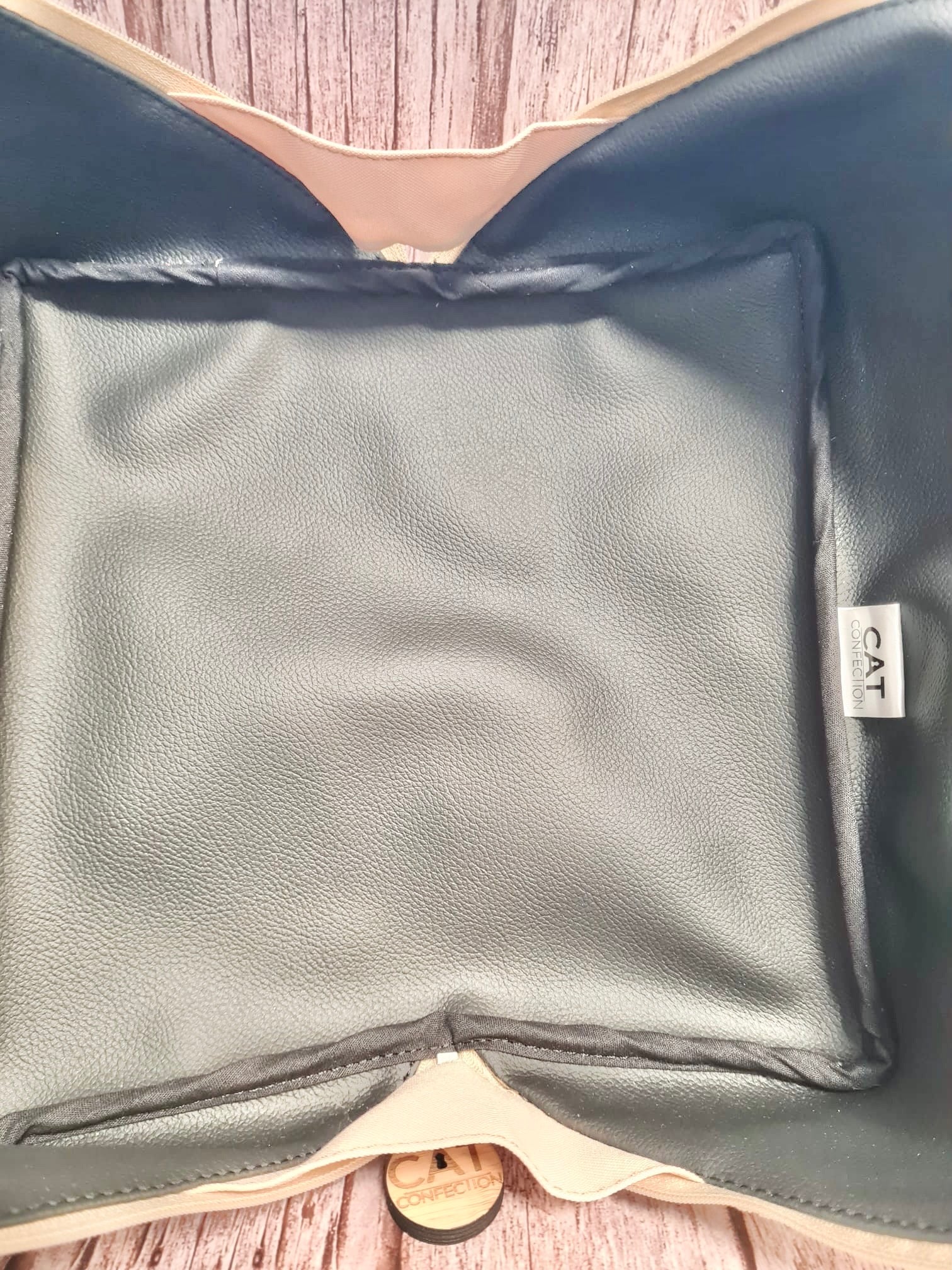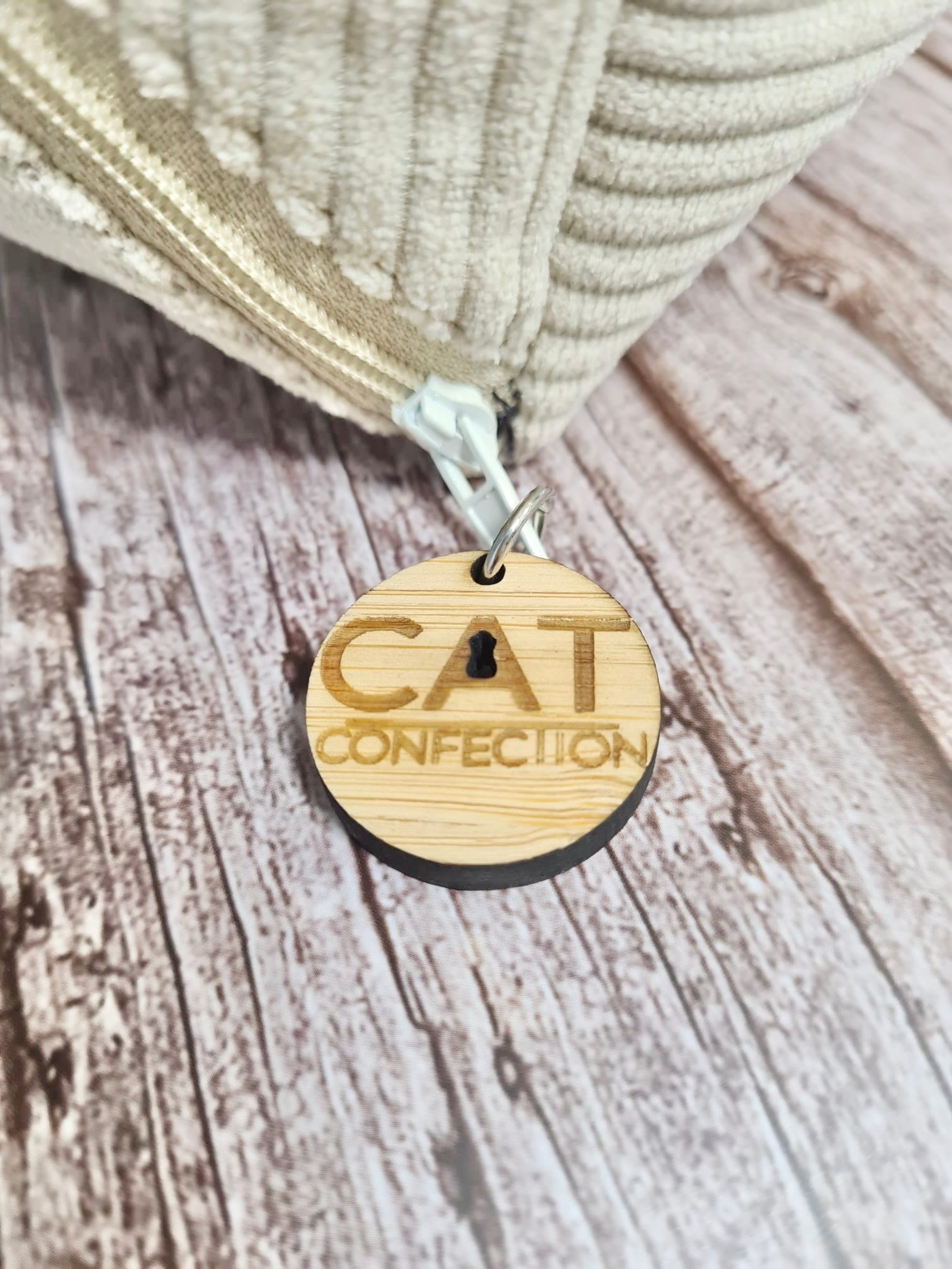 Composition : polyester, simili cuir, logo en bois sur la fermeture.